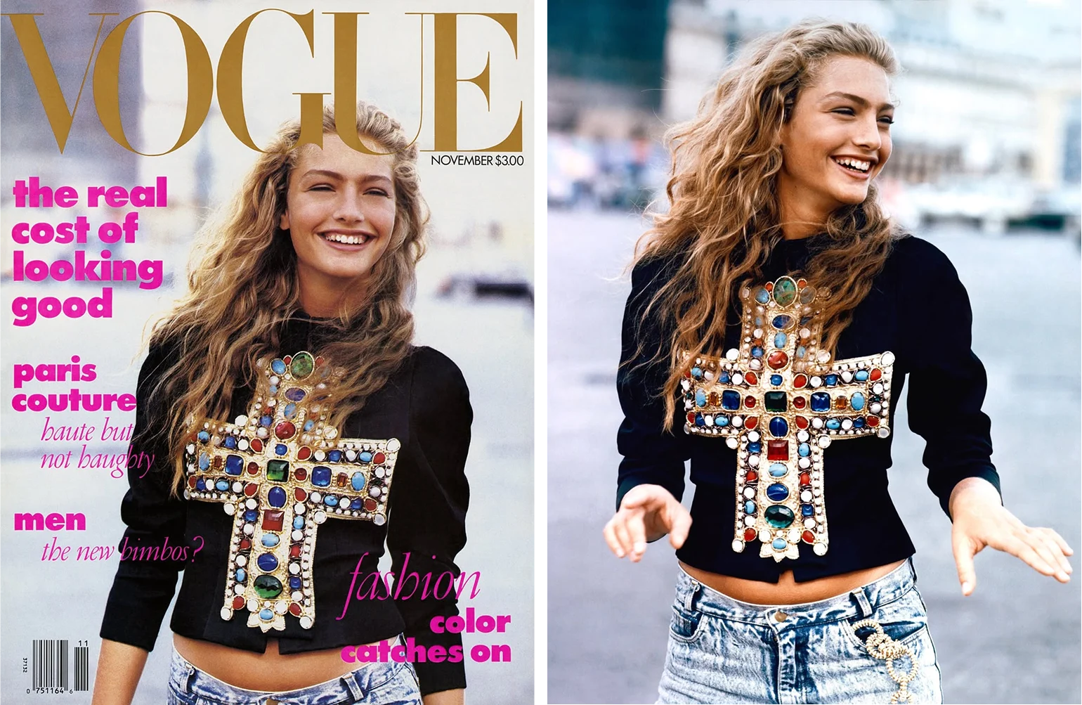 Чималу роль відіграло й походження майбутньої імператорки глянцю. Родом з Лондона, Анна на власні очі бачила яскраві британські 80-ті: народжений Sex Pistols та Vivienne Westwood панк, темна революційна естетика Cocteau Twins, витоки концептуального гламуру та активна рейв-культура. Не дивно, що першу обкладинку Анни для американського Vogue досі вважають однією з найбільш революційних. На фото — 19‑річна модель, одягнена у розшитий дорогоцінним камінням жакет з кутюрної колекції Christian Lacroix та витерті блакитні джинси з масмаркету Guess. Усміхнена та вільна, дівчина позує на вулиці — це був прецедент.
