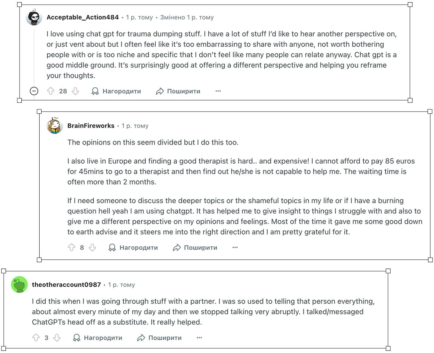 Користувачі Reddit часто пишуть, що зверталися до ChatGPT як до терапевта або співрозмовника, коли обпікалися в стосунках з близькими й втрачали довіру до них. ШІ підтримав багатьох, коли ті переживали втрату або розрив стосунків, допомагав з точковими проблемами, створював простір для травмадампу і речей, за які дуже соромно — навіть перед терапевтом.