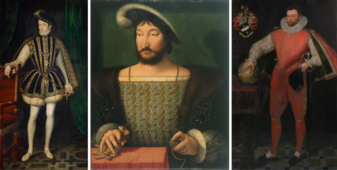 Типовий аристократ XVI століття мав приблизно такий вигляд: об’ємні штани-плундри з яскравою бордовою підкладкою, оксамитовий плащ, оздоблений золотою вишивкою, берет з пером, атласні рукавички та високий мереживний комір. Штани підкреслювали литки, приталені дублети візуально зменшували талію. Чоловіки були павичами — і гордо демонстрували свій гардероб на портретах.