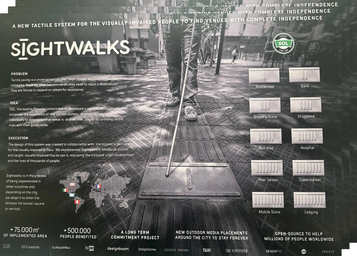 #1. Це торішнє Гран-прі, і цього року знову взяли золото. Виробники бетону Sol Cement з Чилі розробили цілу систему тактильної плитки для людей з порушеннями зору, яку можна впроваджувати на державному рівні. Вони зробили унікальні символи для різних місць: магазинів, банків, аптек, щоб люди чітко розуміли довкілля. Круто.
