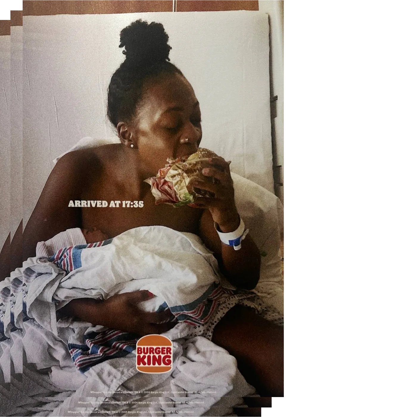 #6. Дуже крутий кейс від Burger King. Вони зробили серію чесних, реалістичних фото про їхню доставку Arrived on time, які прив’язали до моментів народження дітей. Ідея в тому, що в будь-якій ситуації — We arrived on time.
