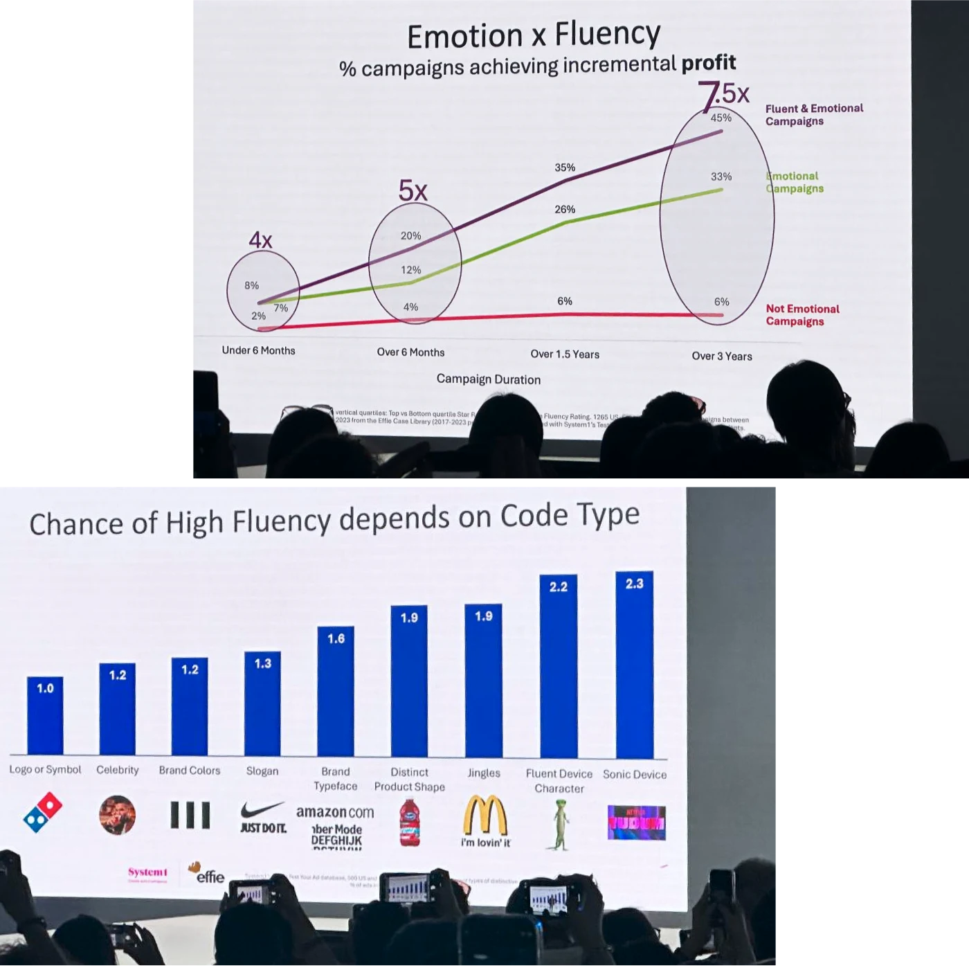 Суть його доповіді полягала в порівнянні емоційної ефективності реклами (за даними System1, що міряє реакції глядачів через eye-tracking і біометрію) з результатами Effie-кампаній за останні 15 років.