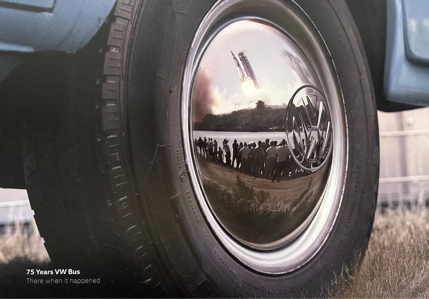 #6. Volkswagen — переможець у категорії «Фото». Бренд, який показує стабільність та історичну тяглість свого фургона Т2 крізь різні історичні події, що відбиваються на колісному диску фургона.