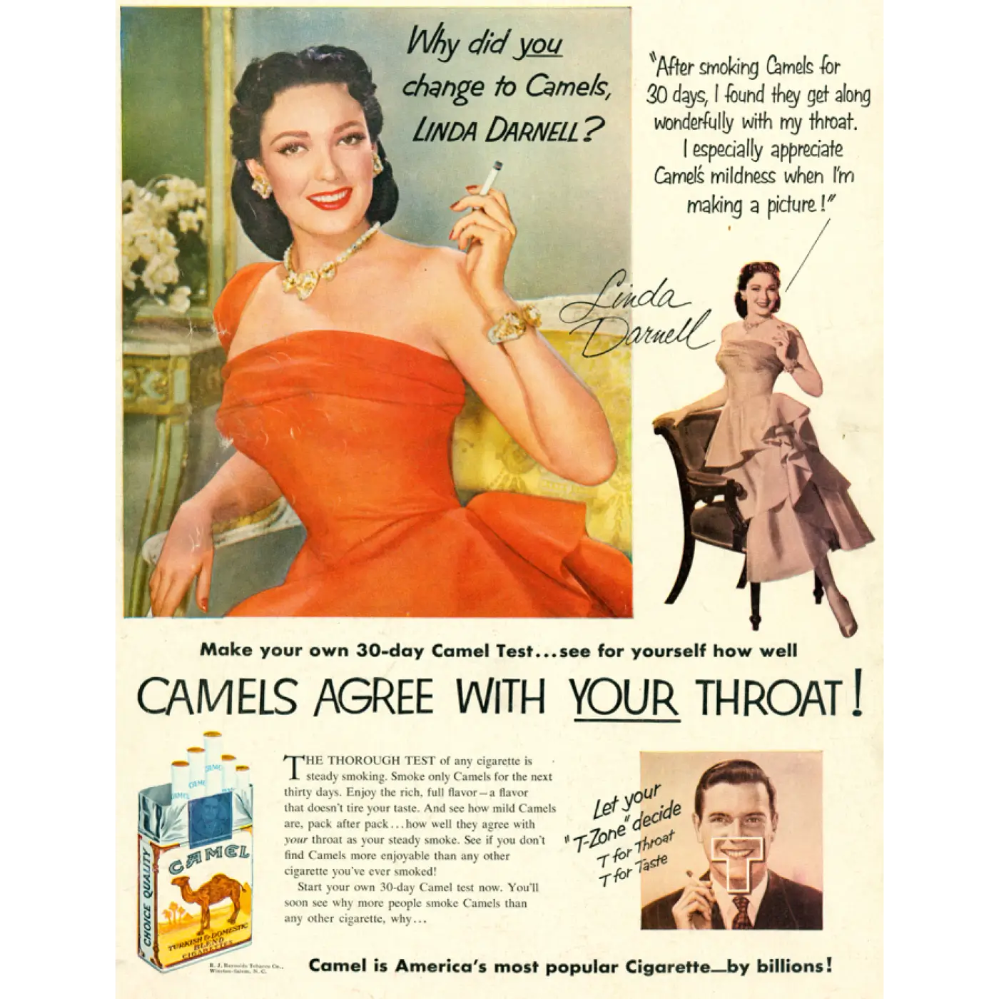 І реклама для тих, хто хвилюється за здоров’я: Camel кращі для твого горла, а зі слів акторки Лінди Дарнел, вони ще й класно виходять на фото.