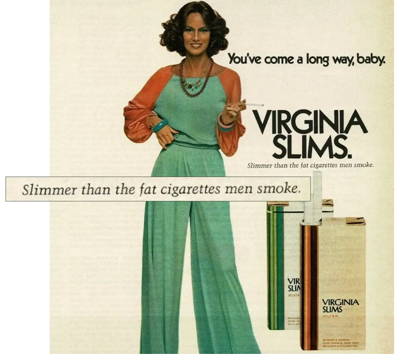 Жінкам продавали іншу мрію — незалежності, фінансової свободи та стрункості. Сигарети й героїні були тоншими, креативи — елегантнішими, а продукт просували як стильний аксесуар. Virginia Slims закріплювала кампанії слоганом «Ти пройшла довгий шлях, крихітко» і лишала у повітрі запитання: якщо не куриш, то чи достатньо ти феміністка?