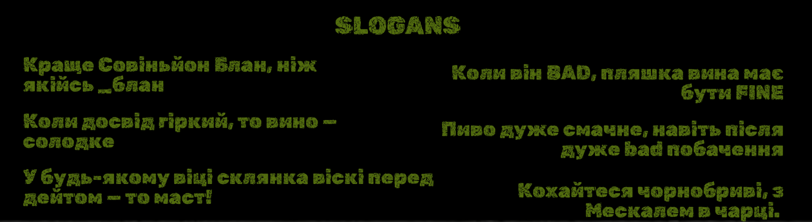 Працюючи над цією рекламою, я дійшла до незвичної концепції: «На жаль, дівчат часто приваблюють “бед бойз”, які не завжди добре до них ставляться. Це може призводити до розчарувань, але водночас відкриває можливість насолодитися якісним вином, перетворюючи втрату на момент насолоди». Цю ідею я навіть додала у своє портфоліо, доповнивши вигаданими слоганами.