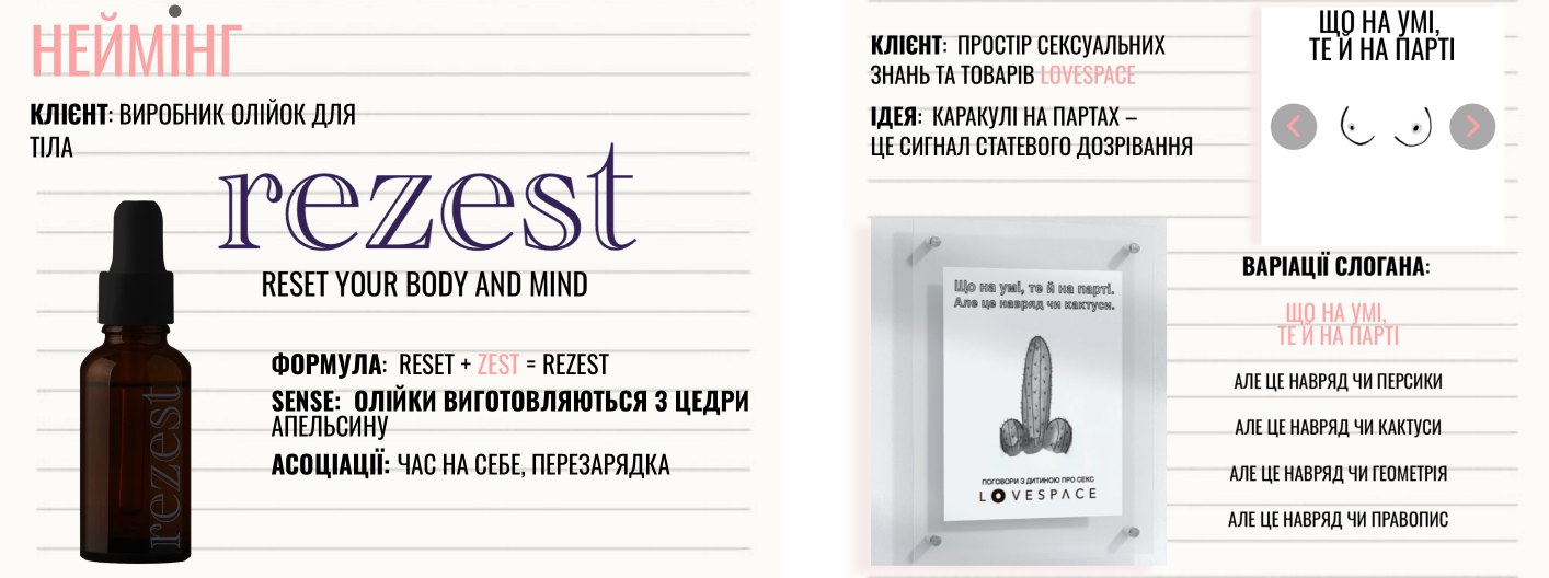 Мені найбільше сподобалось придумувати неймінги та слогани. Круто те, що ми це робили для реальних брендів.