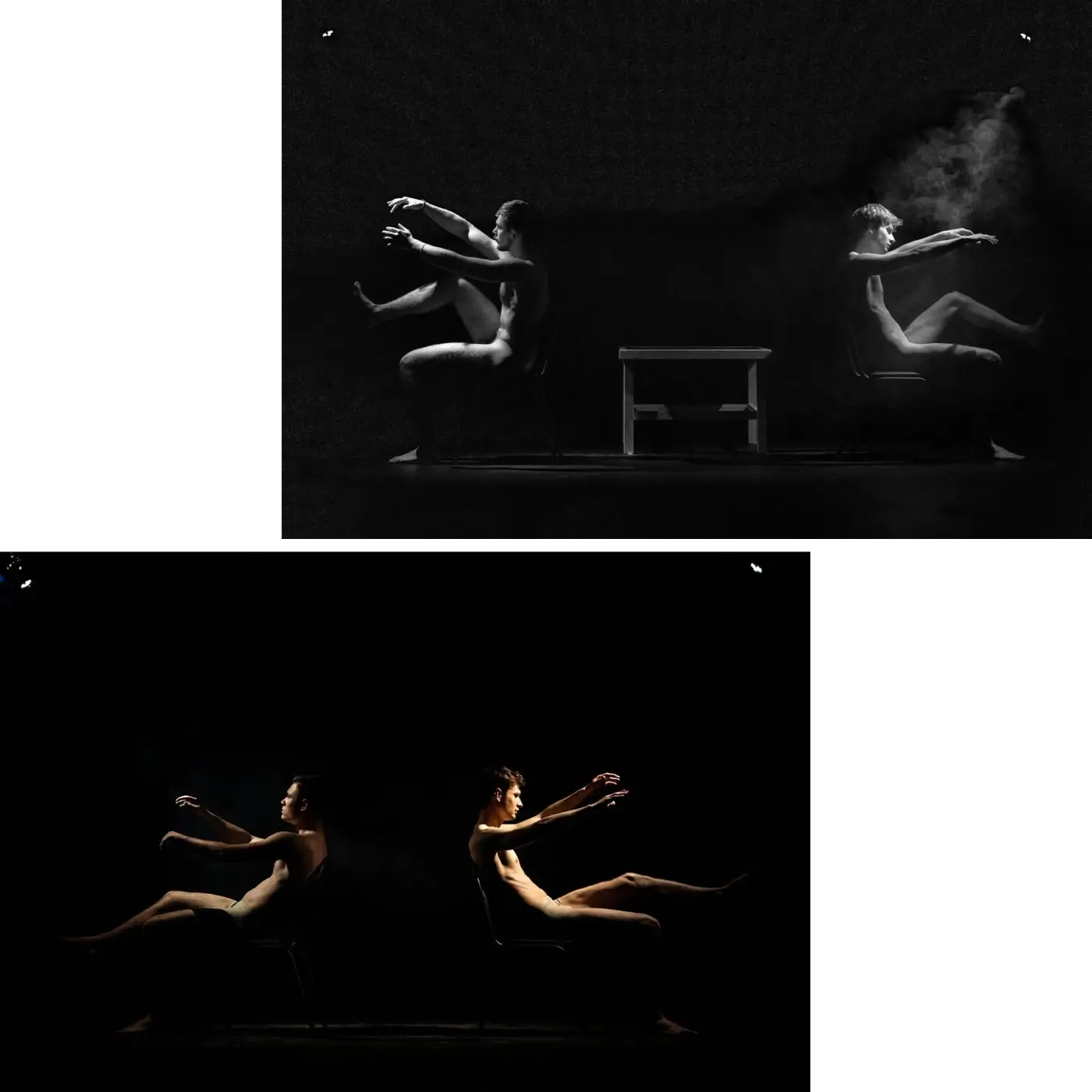 Тож ми домовились, що Іра виступатиме в тілесному боді. Це вплинуло на концепцію та стилістику сцен оголеності, тому актори в початковій сцені також працювали в тілесній білизні — інакше б не зістикувалося. В правильному світлі складалося враження, що актори оголені, але насправді вони були одягнені. Бо що важливіше — концепція чи щоб хтось на сцені голий посидів? Я завжди обираю концепцію.