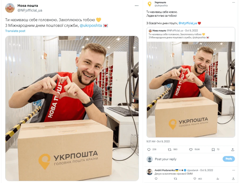 Кейс: «Укрпошта» і «Нова пошта» обмінялися привітаннями з професійним святом — Міжнародним днем поштової служби. Усі знають, що ці двоє — конкуренти. Проте авдиторія схвально сприйняла обмін повідомленнями на офіційних сторінках компаній: