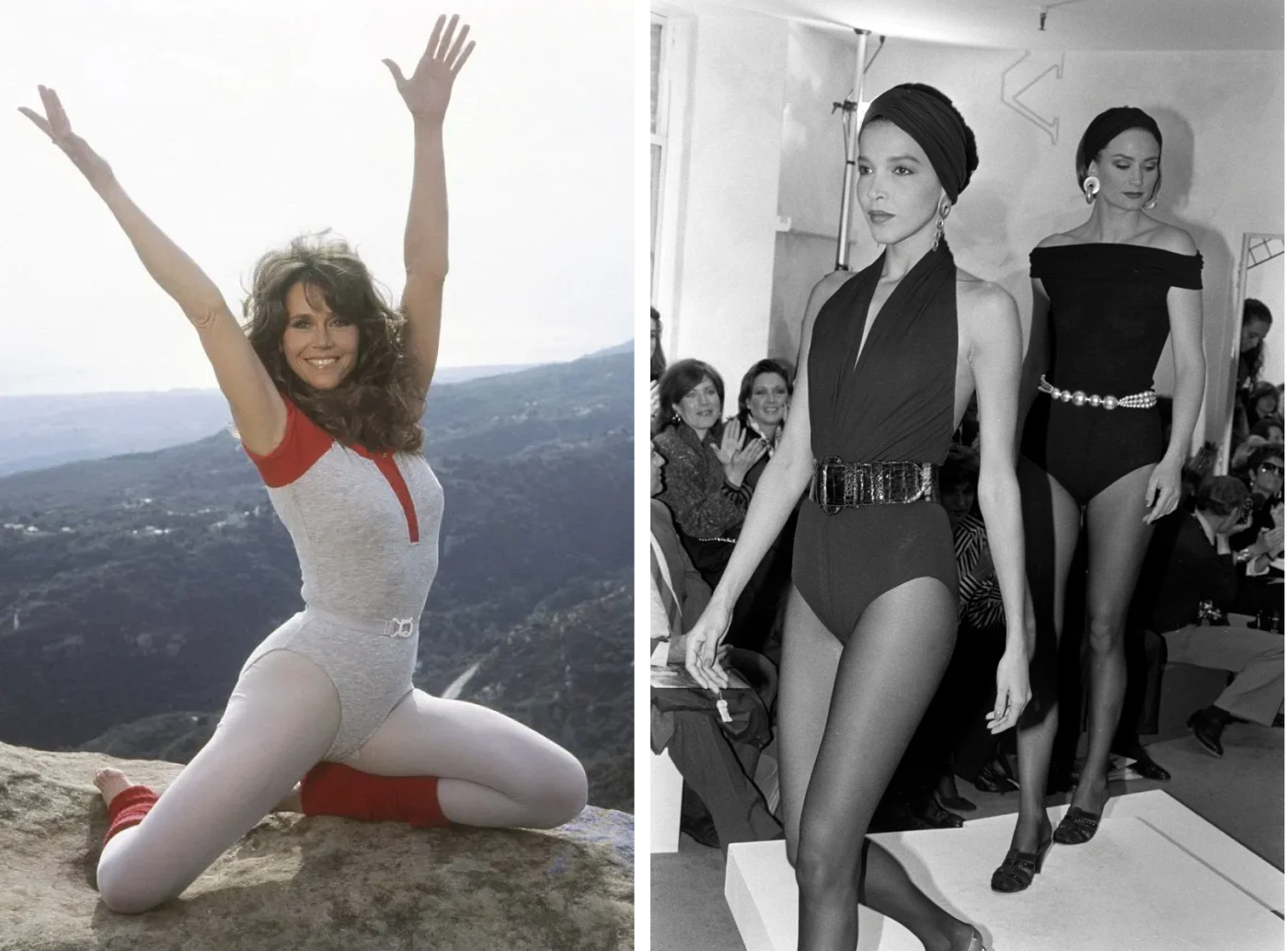 Також серед трендів того часу — еластан, лайкра та інша синтетика, яка лягає на тіло як харчова плівка. Скінні-одяг якраз ставав популярним завдяки Alaïa та Донні Каран, а вони, своєю чергою, брали натхнення зі спортивного одягу. І не лише вони — щонайменше вся Америка намагалася виглядати так, як Джейн Фонда у своїх фітнес-відео. Боді, легінси, светри з відкритими плечима, балет-кор — все це також про 80-ті.