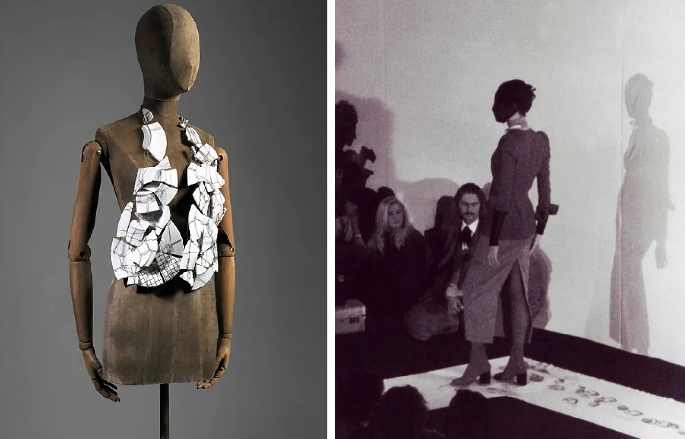 Ймовірно, абзаци вище засмутили б Мартана. Він робив усе, щоб люди звертали увагу на його одяг, — а ми все одно говоримо про шоу, яке відбувалося довкола. Тож про одяг. Серед позачасових виробів: табі — черевики з розділенням між великим та рештою пальців, які Мартан запозичив з японської культури. Обтічний костюм, перешитий навиворіт — приклад плоского крою, який дизайнер також використав у колекції, створеній з лекал. «Пальто‑перука» — маленький жарт про хутряні пальта заможних парижанок. Майже індустріальна металева біжутерія з вигравіюваними числами — тими самими, що й на бирках. Маржела, не менший дослідник, ніж дизайнер, як ніхто вмів у «зловісну долину» — коли бачиш дуже знайомі, але дещо змінені речі.