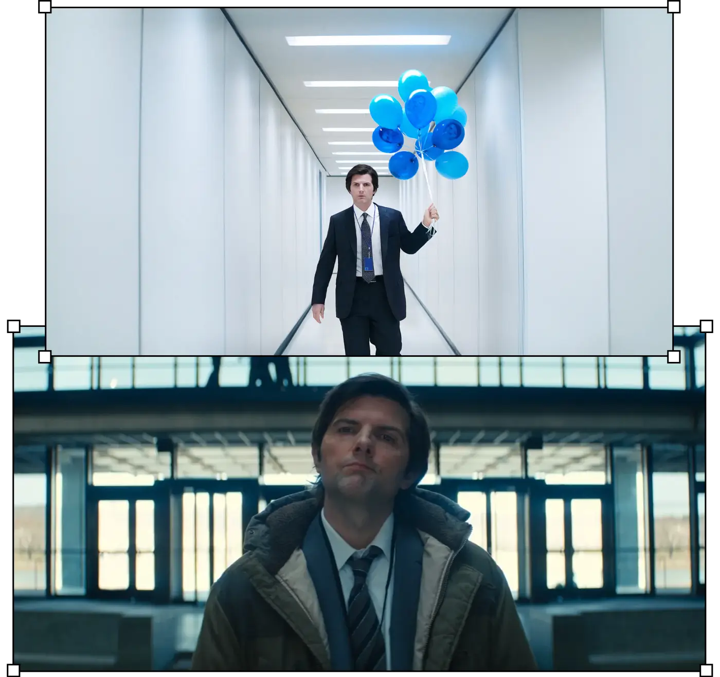 Всі кадри в «Поділі» — симетричні та впорядковані. Персонажі часто розміщені в центрі статичного кадру — і це створює клаустрофобічне відчуття, яке символізує корпоративний контроль Lumon. На противагу цьому, в зовнішньому світі камера більш рухома та часто фокусується на крупних планах героїв.