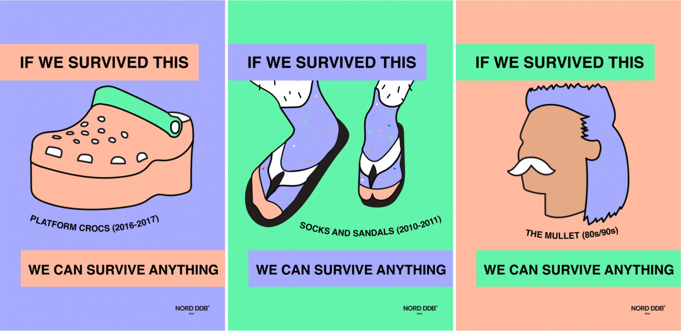 Креатори латвійської агенції Nord DDB під час весняного локдауну розробили серію принтів про біди, які ми вже пережили (тож є всі шанси пережити і жорсткий карантин). Серед найстрашніших подій минулого: шльопанці на шкарпетки та крокси з платформою. Реально страшно: