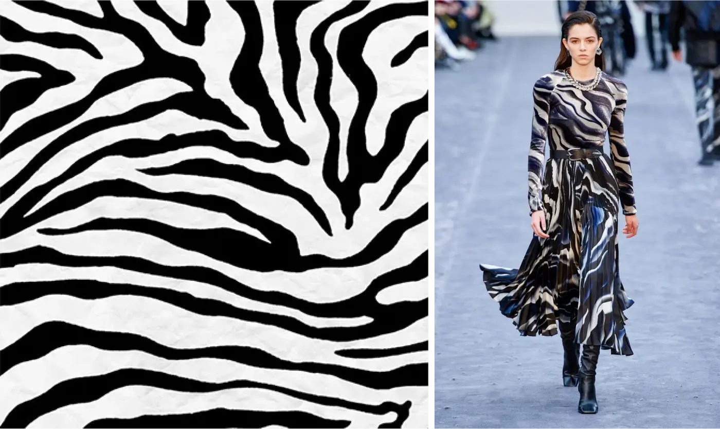 #8. Зебровий. Візерунок, що складається з довгих чорних смуг, щільно розташованих одна біля одної на білому тлі. Асоціюється з динамікою, виразністю й сміливістю. У 1980-х роках популярність принту зросла завдяки впливу американського модельєра Патріка Келлі, відомого своєю любов'ю до африканської культури. Пізніше Dolce & Gabbana та Roberto Cavalli надали принту нових інтерпретацій та кольорів.