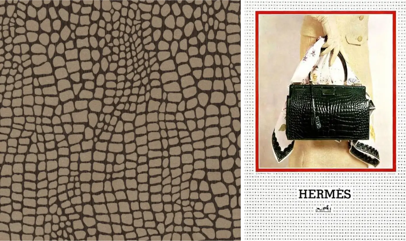 #3. Крокодилячий. Текстурний візерунок, що імітує шкіру крокодила, з характерними великими лусочками, які виглядають рельєфно й масивно. Асоціюється з розкішшю та елегантністю. Наприкінці XIX століття цей матеріал став улюбленим серед модних брендів Франції та Італії. Наприклад, Hermès і Gucci, які почали використовувати крокодилячий принт для створення сумок, взуття й аксесуарів.