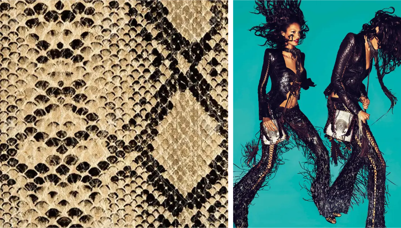 #4. Зміїний. Імітує текстуру луски на шкірі змії, з характерними дрібними ромбоподібними або сітчастими візерунками, часто в сірих, зелених, коричневих або бежевих відтінках. У 1960-х роках, на хвилі бунтарства і сексуальної революції, цей принт набув особливої популярності. Його люблять використовувати у своїх колекціях бренди Gucci та Roberto Cavalli, підкреслюючи сміливість, елегантність і магнетизм.