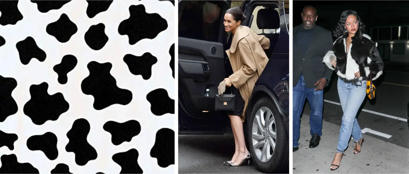 #5. Коров’ячий. Візерунок, що імітує природні плями на шкірі корови, зазвичай в чорно-білій або коричнево-білій гаммі. Вперше з'явився на подіумах у 2018 році в таких дизайнерів, як Calvin Klein і Balenciaga. Цей принт вважається більш примітивним та невимушеним, оскільки асоціюється з сільським стилем, на відміну від леопардового або тигрового, які символізують хижаків. Дизайнери використовують коров’ячий принт у неформальних або креативних контекстах. Коров’ячий візерунок вподобали інфлюенсери та ікони моди, такі як Ріанна і Меган Маркл.