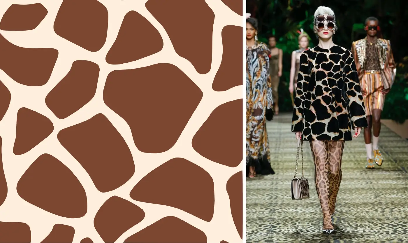 #6. Жираф’ячий. Складається з великих асиметричних плям із чіткими контурами на світло-коричневому або бежевому тлі. Подібно до коров’ячого, це сміливий неординарний візерунок, але завдяки своїм нейтральним кольорам він набагато стриманіший. У моді жираф'ячий принт з'явився у 1960-х роках, коли дизайнери прагнули додати атмосферу африканського сафарі у свої колекції. Відтоді він періодично повертається в тренди як цікава альтернатива класичним леопардовим або зміїним візерункам.