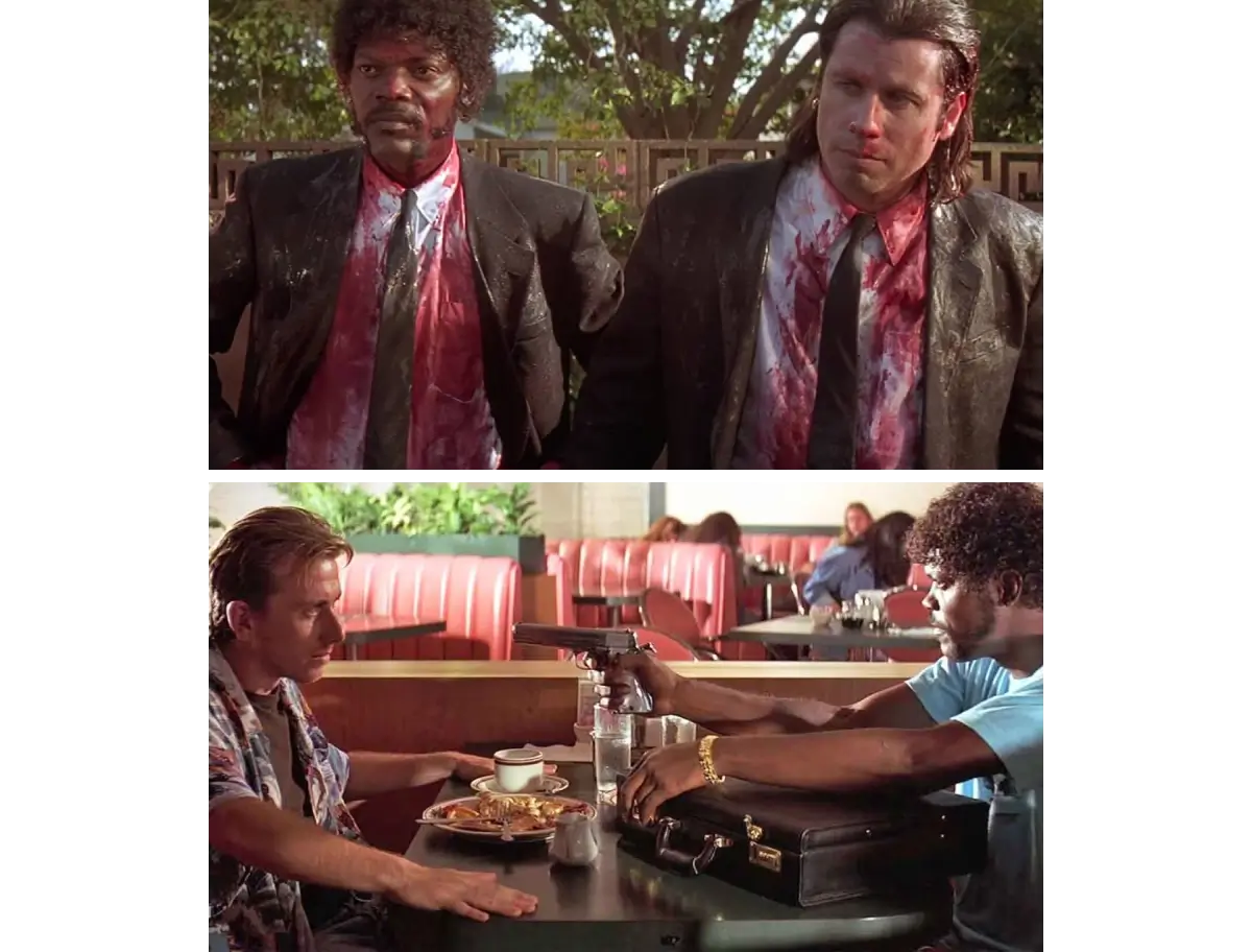 #1. Нелінійність. Тарантіно не першим вигадав змінювати часові рамки зображуваного, коли це зручно для драматургії. Він і не приховує, що його надихає режисер Французької нової хвилі Жан-Люк Годар, який експериментував із хронологією подій на монтажі. Але саме нелінійність оповіді робить «Кримінальне чтиво» унікальною кримінальною драмою із сатиричним контекстом. Бо раніше так ніхто не робив у жанровому кіно.