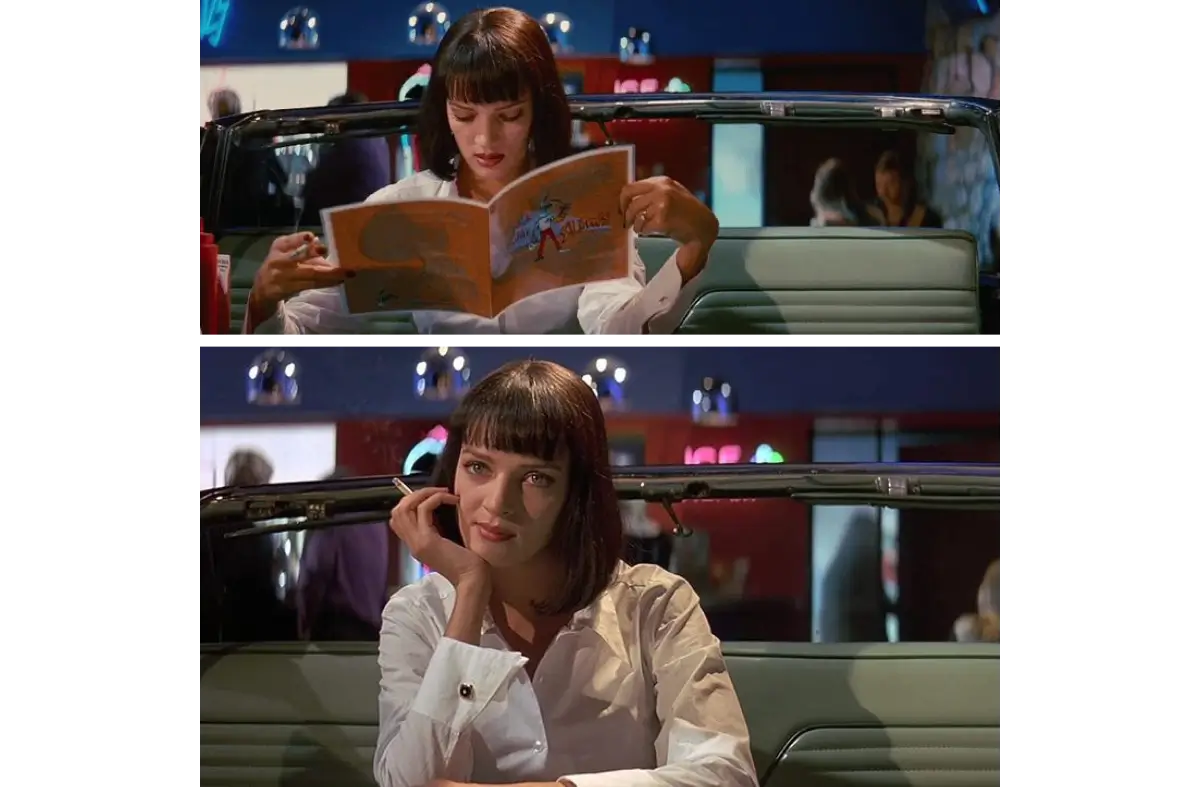 #4. Неоригінальність (у хорошому сенсі). «Великі митці крадуть. Вони не роблять омажі», — говорив Квентін в одному з інтерв’ю. Тарантіно часто називають оригінальним у сценарних та режисерських рішеннях, але очевидно (і він цього не приховує), як проявляється його надивленість, — наприклад, в епізоді танців Мії Воллес та Вінсента Веги. Там і Бетмен, і «Банда аутсайдерів» Годара (до речі, так називалася продакшн-компанія Квентіна — Bande à part), і анімація «Аристократи» й драма «Вісім з половиною» Федеріко Фелліні.