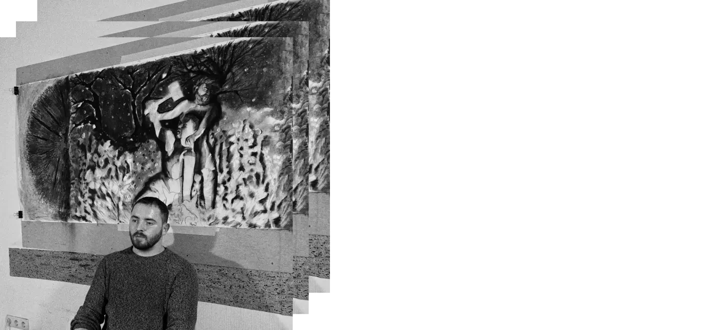Проживаю в Києві з 2019 року, сам з Рівненщини. За освітою соціальний працівник. Мене не взяли в художній ВНЗ, але я самотужки навчився малювати. Працюю на «Новій Пошті» та орендую майстерню, де займаюся мистецтвом у вихідні. Досліджую живопис, графіку та експериментальні техніки.