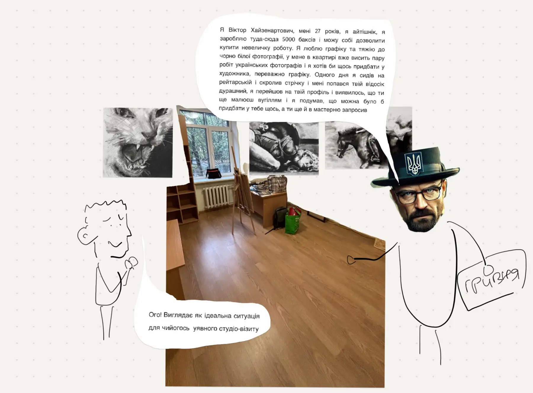 В кінці свого зіну я вставив завдання з попередньої лекції — уявний візит до майстерні. Ганяв дурня, люблю це. Особливо коли відчуваєш якусь напружену серйозність. Завжди хотів йти проти течії. У школі, коли треба було написати твір про хорошого героя, я писав, що він поганий. Прикалувався з вчительки, але їй це теж подобалось.